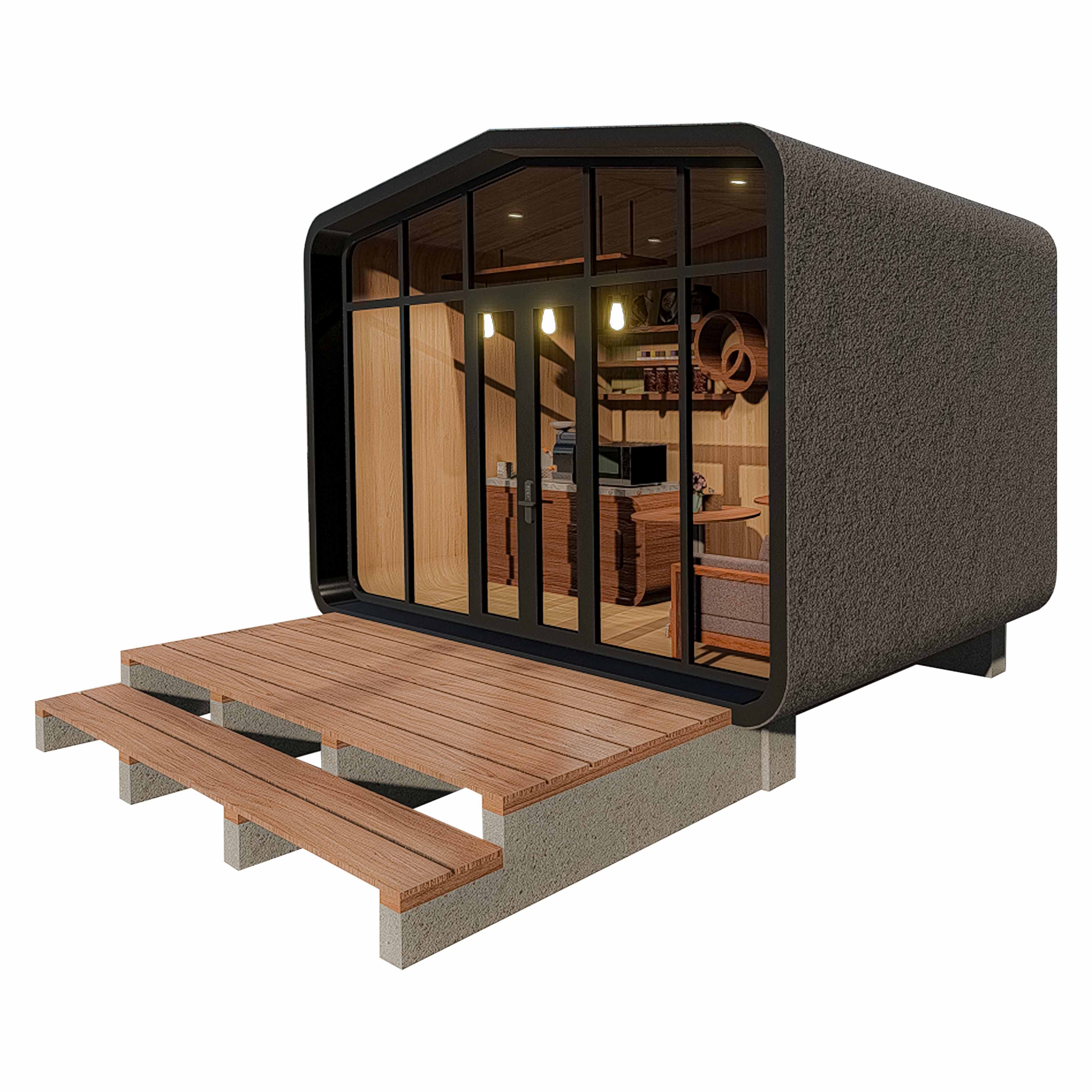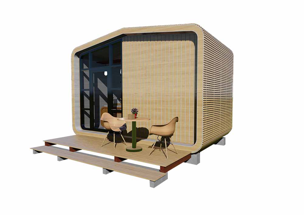Comprised of 2 modules with total space of 11m2. Shell is a multipurpose micro pod, perfect for home office, sleeping pod, grab & go cafe and many other commercial purpose.